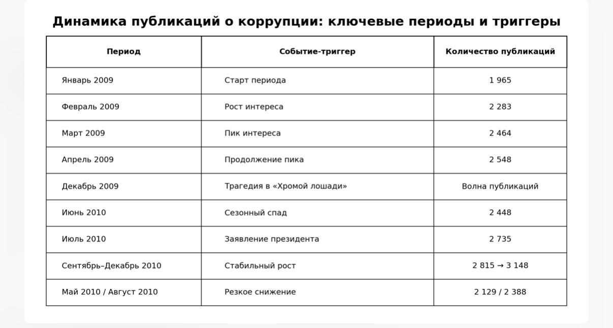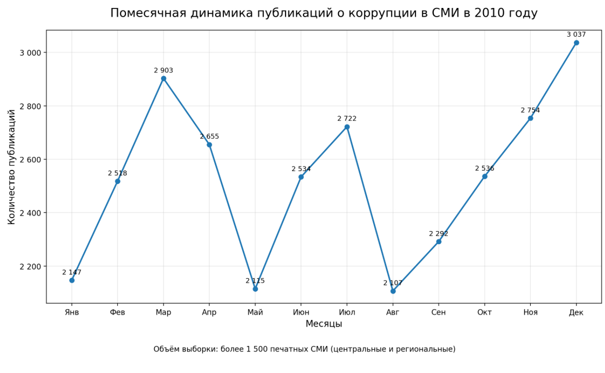Косвенно данные генпрокурора подтверждаются низкой активностью темы коррупционных разоблачений в российских СМИ. Количество публикаций на протяжении исследуемого периода практически не меняется. Редкие всплески интереса вызваны либо трагическими последствиями коррупционных деяний, либо озвучиванием новых антикоррупционных инициатив президента. Так, трагические события в пермском клубе вызвали волну публикаций о преступной халатности и коррупционных схемах при строительстве и обеспечении пожарной безопасности. Всплески публикаций также фиксировались в периоды внимания прессы к созданию новых антикоррупционных подразделений и к требованиям о декларировании доходов госслужащих.