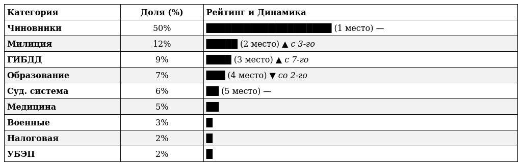 По результатам исследования СМИ, чиновники прочно держат первое место по количеству упомянутых фактов взяточничества и злоупотреблений. Сотрудники милиции улучшили свой результат и поднялись с третьего места на второе — можно предположить, что подобный подъём связан с обсуждением проекта федерального закона «О полиции». Сотрудники ГИБДД также заняли более высокую позицию, получив третье место. Работники образования, ранее занимавшие лидирующие позиции, опустились на четвёртое место. Работники судебной системы занимают пятое место. Оставшуюся долю распределили между собой работники медицины, военные ведомства, налоговые служащие, сотрудники УБЭП и представители других сфер. В раздел «Другие» вошли категории, упомянутые в немногочисленных эпизодах коррупции: УФМС, таможня, МЧС, пожарные, лесничие.